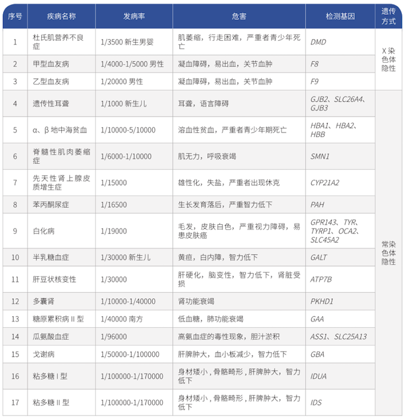 ? ? 我國每年新增90萬例出生缺陷兒,單基因病是導(dǎo)致新生兒出生缺陷的主要原因之一。OMIM數(shù)據(jù)庫(在線人類孟德爾遺傳數(shù)據(jù)庫)收錄的遺傳病約有7000種,其中發(fā)病機制明確的約有5000種,平均每個正常人攜帶2.8個隱性遺傳病致病突變。我國常見的單基因遺傳病有遺傳性耳聾、杜氏肌營養(yǎng)不良癥、地中海貧血、肝豆狀核變性、苯丙酮尿癥等17種,人群綜合攜帶率高達25%。這些疾病往往會致死或致畸,嚴重危害患者健康,給社會和家庭帶來極大負擔(dān)。