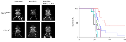 2019年12月,Nature Medicine發(fā)表對(duì)免疫檢查點(diǎn)治療效果好和不好的5種癌癥類(lèi)型,共94例患者進(jìn)行單細(xì)胞蛋白和單細(xì)胞RNA測(cè)序,在多形性膠質(zhì)母細(xì)胞瘤中發(fā)現(xiàn)了一個(gè)獨(dú)特的CD73hi巨噬細(xì)胞群,在抗PD-1治療后仍然存在。通過(guò)構(gòu)建CD73敲除鼠發(fā)現(xiàn)CD73的缺失提高了抗CTLA-4和抗PD-1治療的多形性膠質(zhì)母細(xì)胞瘤小鼠模型的存活率。證實(shí)CD73是一種特異性的免疫治療靶點(diǎn),可提高多形性膠質(zhì)母細(xì)胞瘤免疫檢查點(diǎn)治療的抗腫瘤免疫應(yīng)答。
