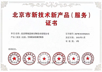 “北京市新技術(shù)新產(chǎn)品(服務(wù))認(rèn)定”旨在推動(dòng)高新技術(shù)產(chǎn)業(yè)的發(fā)展,作為北京市新技術(shù)新產(chǎn)品,應(yīng)擁有自主知識(shí)產(chǎn)權(quán),并具有技術(shù)先進(jìn)性和創(chuàng)新性。本次喜獲“空間轉(zhuǎn)錄組測(cè)序服務(wù)”榮譽(yù)證書是各委員會(huì)對(duì)博奧晶典創(chuàng)新能力的高度贊揚(yáng)和肯定,同時(shí)體現(xiàn)了博奧晶典空間轉(zhuǎn)錄組測(cè)序服務(wù)在行業(yè)內(nèi)的技術(shù)優(yōu)勢(shì)。