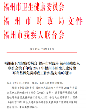 福州市新生兒耳聾基因篩查項目將在5月1日于指定采血機構(gòu)全面展開,篩查對象為在福州市指定采血機構(gòu)出生的常住人口新生兒(篩查對象需提供父母一方的身份證、戶口簿或居住證復(fù)印件),采用耳聾基因芯片檢測技術(shù),對新生兒四個常見耳聾基因的15 個突變位點進(jìn)行檢測。聯(lián)合物理聽力篩查,準(zhǔn)確做出耳聾病因分析,提出早期干預(yù)措施,減少聽力疾病兒童的發(fā)生率,真正實現(xiàn)“早發(fā)現(xiàn)、早診斷、早干預(yù)”,達(dá)到有效預(yù)防出生缺陷的目標(biāo),減輕家庭和社會負(fù)擔(dān),促進(jìn)社會和諧發(fā)展。