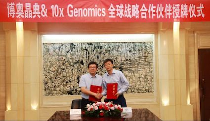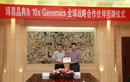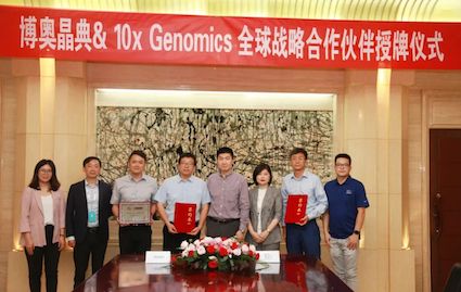 仁科生物科技集團有限公司執(zhí)行總裁邱雁南代表10x Genomics 與博奧晶典副總裁孫義民簽訂戰(zhàn)略合作協(xié)議,10x Genomics公司中國區(qū)總經(jīng)理江滔授予博奧晶典“10x Genomics一站式解決方案全球戰(zhàn)略合作伙伴”稱號,雙方旨在單細胞及空間組學(xué)等領(lǐng)域建立更為廣泛而深入的戰(zhàn)略合作關(guān)系,為客戶提供10x Genomics產(chǎn)品的一站式解決方案。