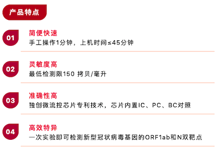 基于全新一代先進(jìn)的芯片實(shí)驗(yàn)室(Lab-on-a-chip)設(shè)計(jì)理念,化繁為簡(jiǎn),檢測(cè)時(shí)僅需將樣本保存液加入芯片,封閉芯片后即可上機(jī),手工操作小于1分鐘。生物反應(yīng)全程(包括核酸提取、核酸純化、擴(kuò)增反應(yīng)、核酸檢測(cè)和結(jié)果判讀等)均集成在一個(gè)整體密閉、內(nèi)部分區(qū)的微流控芯片內(nèi),由全自動(dòng)核酸分析儀完成,因此無需專業(yè)分區(qū)實(shí)驗(yàn)室,無需人工干預(yù),最大程度降低操作人員感染及樣本間交叉污染的風(fēng)險(xiǎn)。45分鐘完成實(shí)驗(yàn)全過程,最快可在35分鐘內(nèi)檢出新冠陽性樣本,檢測(cè)靈敏度可達(dá)150拷貝/毫升,在截至目前國(guó)內(nèi)獲批的同類產(chǎn)品中靈敏度最高,真正實(shí)現(xiàn)“樣本進(jìn)-結(jié)果出”。