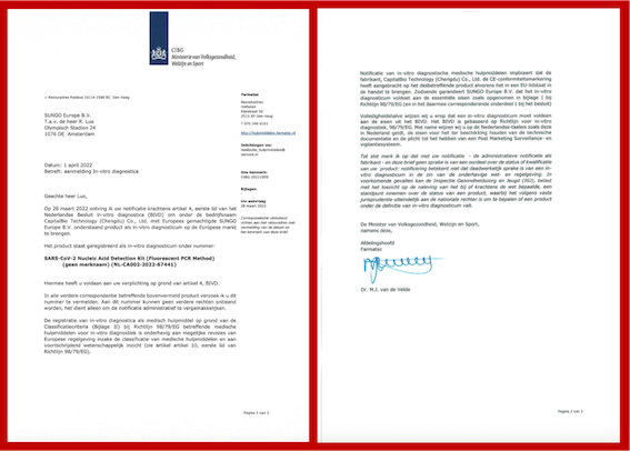 2022年11月4日,博奧晶典新冠病毒核酸檢測整體解決方案再添新成果,凍干型高靈敏度的新型冠狀病毒(2019-nCoV)核酸檢測試劑盒 (熒光PCR法)正式獲得醫(yī)療器械注冊證(國械注準:20223401469)。這是國家藥品監(jiān)督管理局審批通過的首個凍干型新冠病毒核酸檢測試劑盒,同時具備中國NMPA和歐洲CE“雙證”,為堅持“動態(tài)清零”,全面加強常態(tài)化疫情防控能力建設(shè)提供全新戰(zhàn)疫利器。