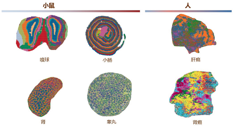 目前對人和小鼠的多種組織,包括嗅球、小腸、腎臟、肝等進(jìn)行空間轉(zhuǎn)錄實(shí)驗(yàn),繪制各種細(xì)胞類型在組織中的精細(xì)空間分布(圖4)。